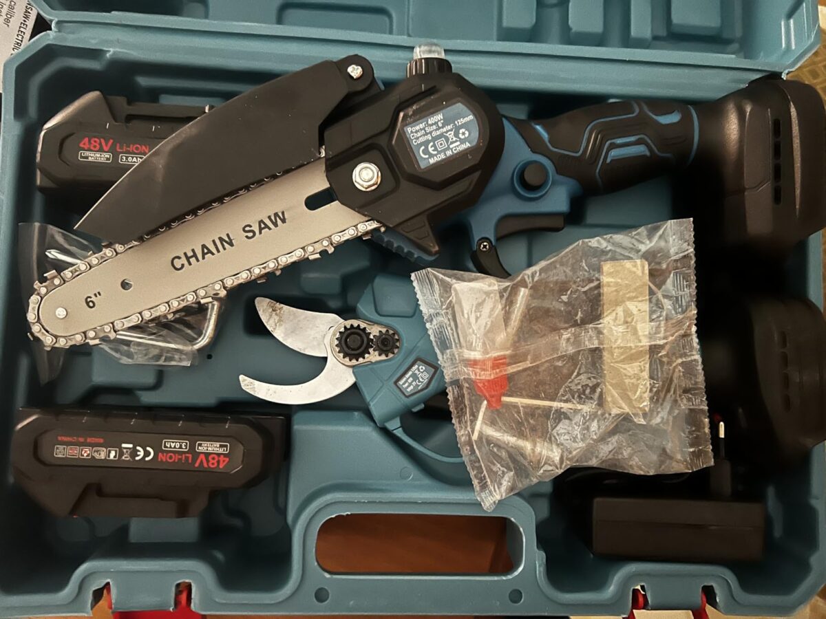 2-in-1: Battery Shears + Chainsaw 48V. A complete pruning kit: electric shears that open up to 35 mm and a 6″ mini chainsaw for thicker branches. Cordless, lightweight, and easy to use anywhere.